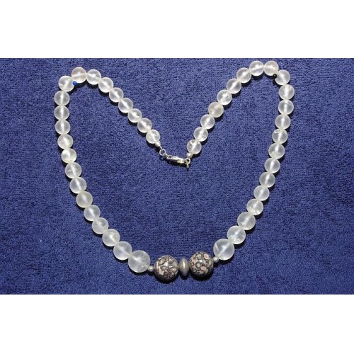 aufwendig gearbeitete Edelsteinkette mit Bergkristall Kugeln 10 bis 14 mm sowie Leopardenfelljaspis Kugeln 16 mm , mittig Silberelement Länge: 54 cm Verschluss: 925 Silber