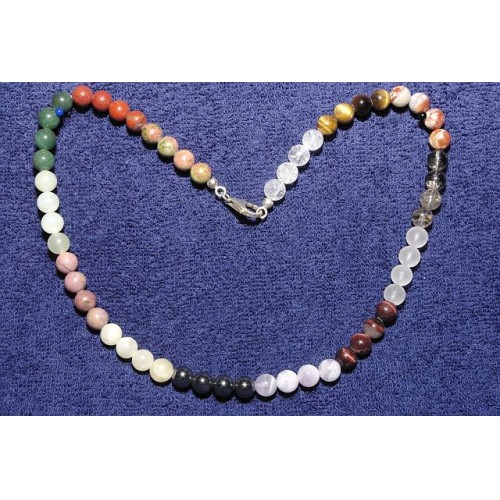 aufwendig gearbeitete Edelsteinkette mit Unakit, Jaspis, Aventurin, Jade, Rhodonit, Hämatit, Amethyst, Bergkristall, Rauchquarz und Tigeraugen Kugeln 8 mm Länge: 47 cm Verschluss: 925 Silber