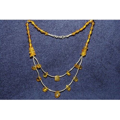aufwendig gearbeitete Edelsteinkette mit Bernsteintropfen sowie Silberelementen Länge: 48 cm Verschluss: 925 Silber