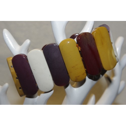 aufwendig gearbeitetes Mookait Armband Breite: ca. 35 mm Durchmesser: ca. 55 mm Material: Mookait (ca. 35 x 13 mm) , Gummiband, ein absoluter Blickfang